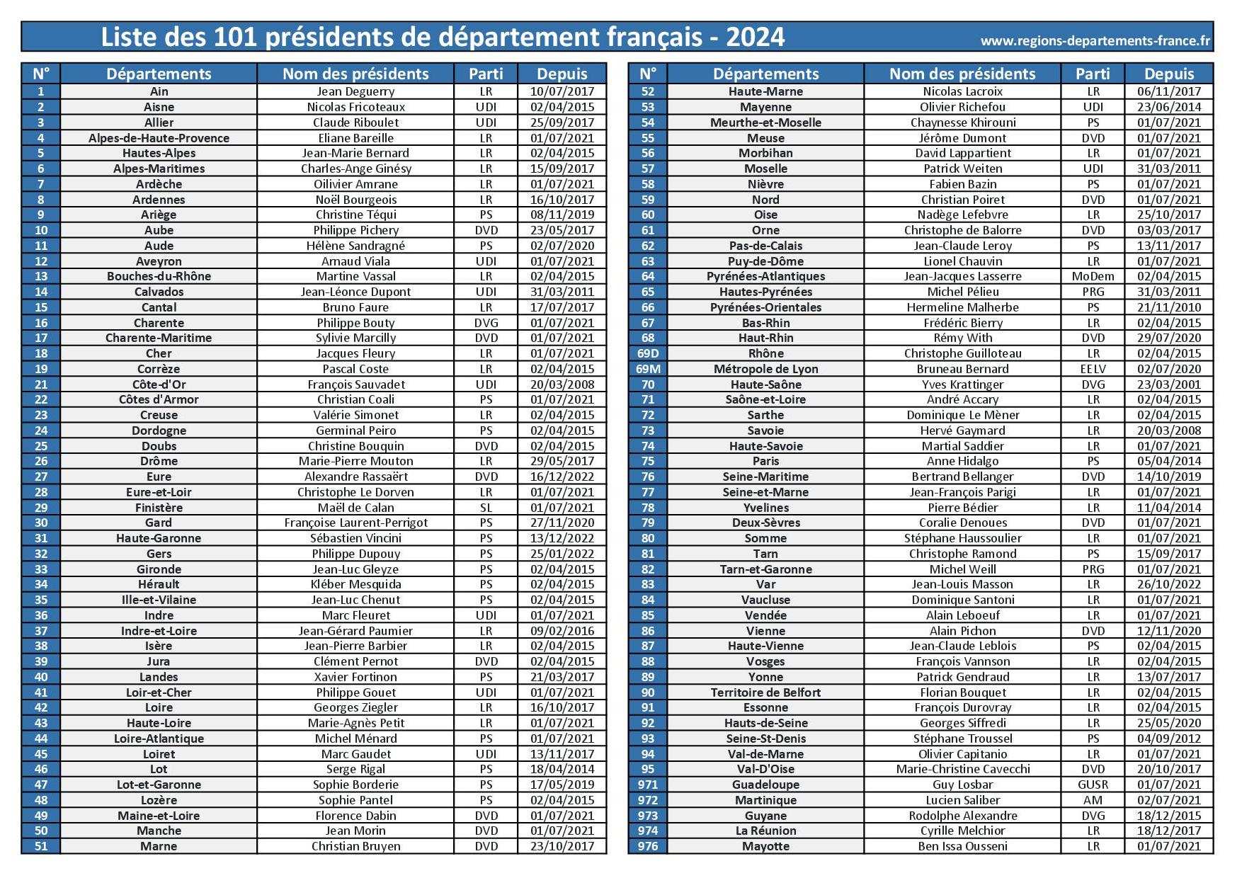 Le tableau ci-dessous liste pour chaque département français le nom, le parti politique et la date de début de mandat de chacun des 101 présidents de département.