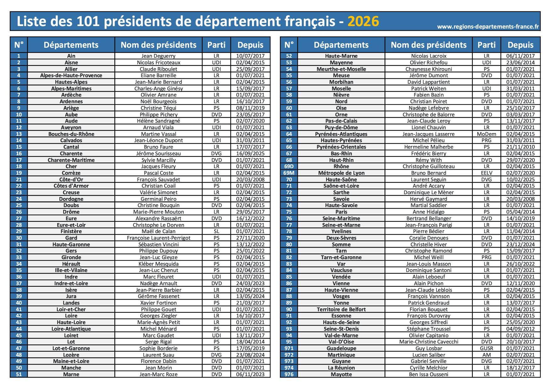 Liste des présidents de département à imprimer - 2026